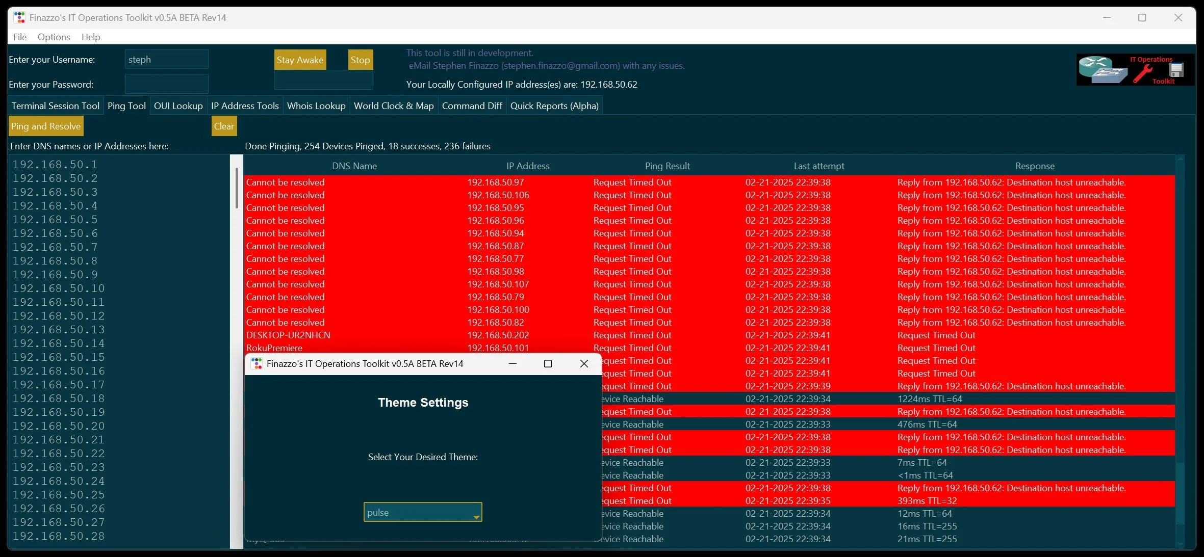 Basic usage of the ping tool to quickly ping and resolve DNS for a list of IPs or devices already populated on the Terminal Session Tool